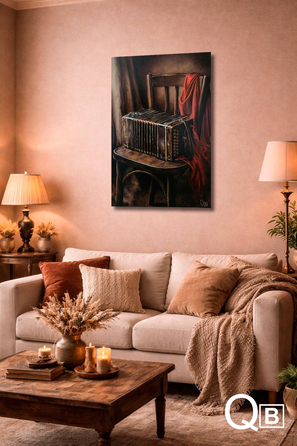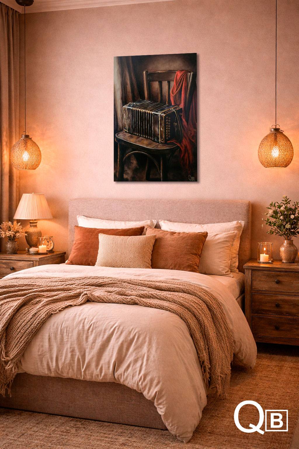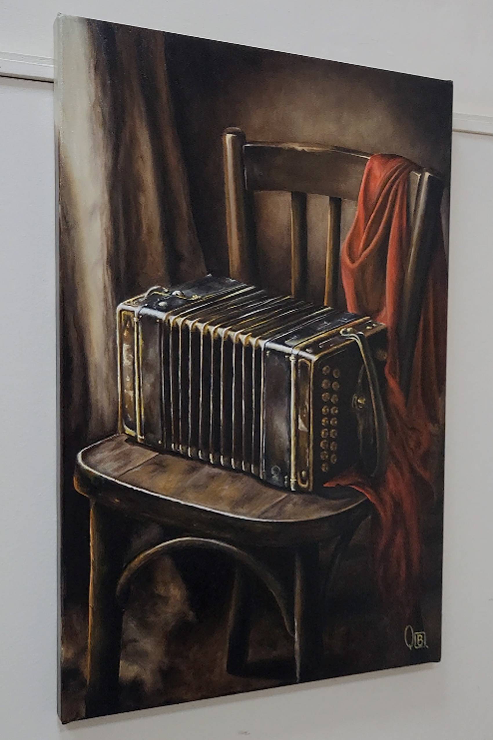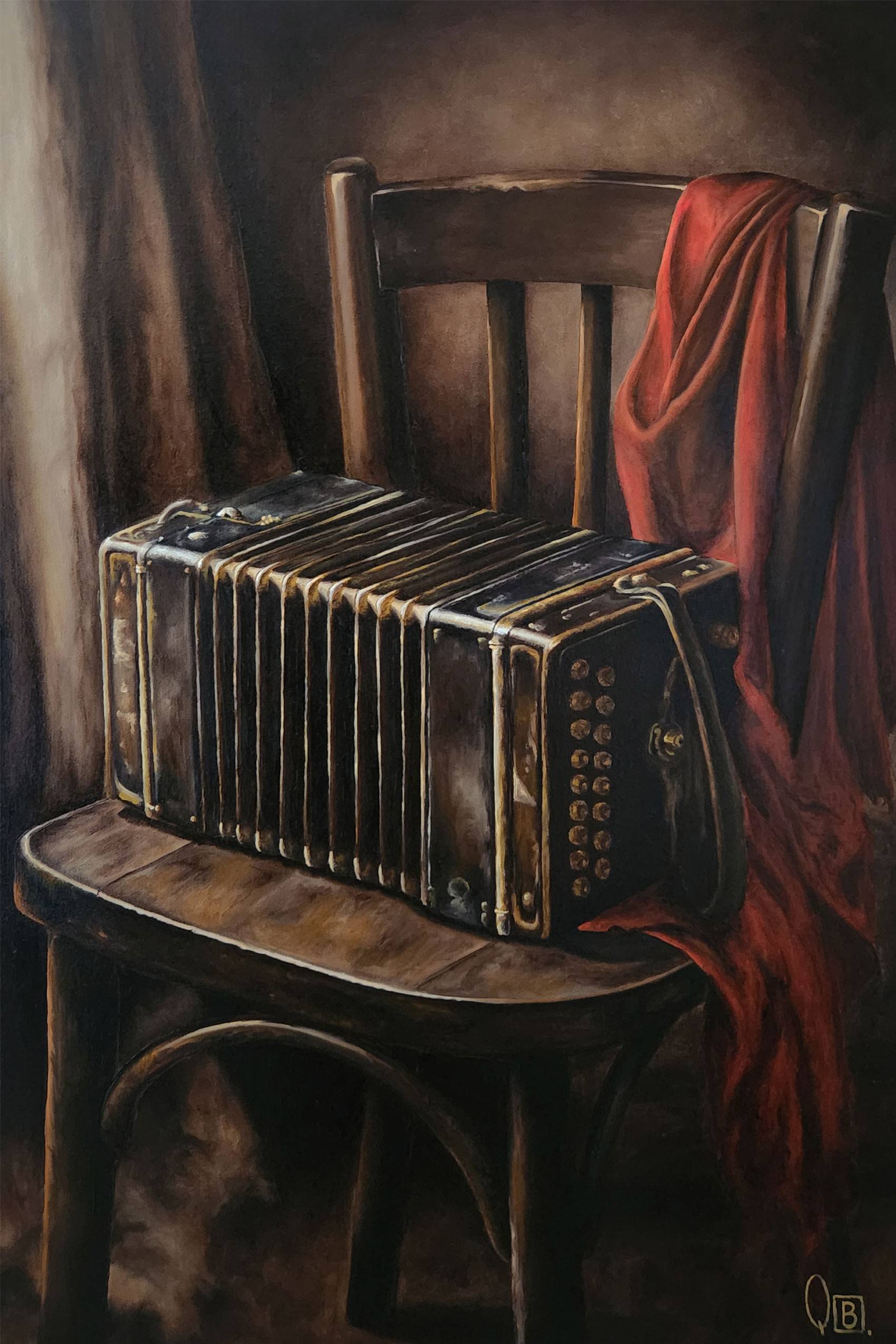 El tratamiento realista no busca solo fidelidad visual, sino densidad simbólica. Aquí, lo tangible se vuelve narrativo. El bandoneón no está simplemente apoyado: está esperando. Su estructura cerrada, contenida, sugiere un aliento suspendido, como si guardara en su interior la próxima melodía.
